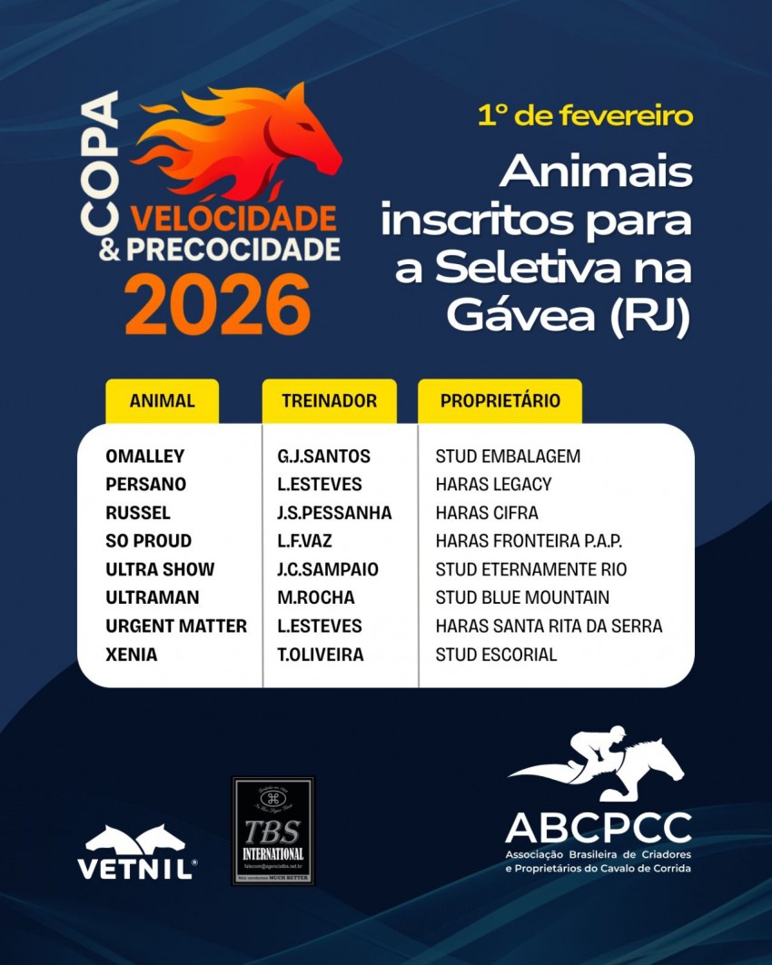 Nesta segunda-feira (26), foram conhecidos os animais inscritos na seletiva do Rio de Janeiro para a Copa Precocidade e Velocidade ABCPCC. Ao todo, 8 produtos da geração 2023 medirão forças, no próximo domingo (1º), na Gávea, em busca de um lugar na grande final.