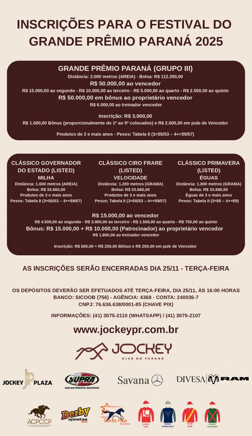 As inscrições serão recebidas na próxima terça-feira (25/11). O custo da inscrição para o GP Paraná será de R$ 3 mil (R$ 1 mil revertido em premiação e R$ 2 mil em pule de vencedor) e de R$ 500,00 para os demais páreos clássicos (R$ 250,00 revertidos em premiação e R$ 250,00 em pule de vencedor).