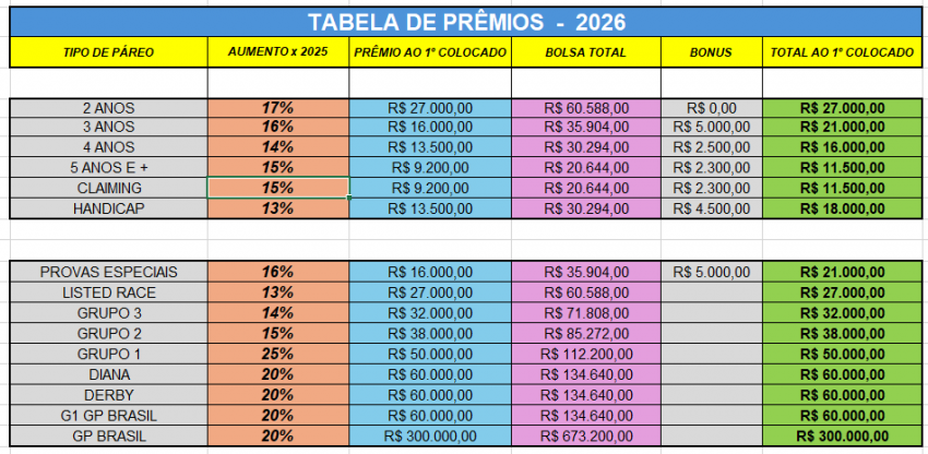 Com 20% de aumento em relação às premiações distribuídas em 2025, os Grandes Prêmios Brasil, Cruzeiro do Sul, Diana e demais provas de graduação máxima do festival do GP Brasil, encontram-se no topo da lista de reajustes nas premiações, para o ano que se aproxima. Outra novidade veiculada pelo JCB a respeito do tema é o pagamento de bônus que será praticado em benefício dos proprietários ganhadores de páreos de turma, além do bônus para criadores de produtos de 3 anos (que replica, portanto, o já realizado bônus para criadores de produtos de 2 anos, conforme regulamento do JCB). Confira abaixo: