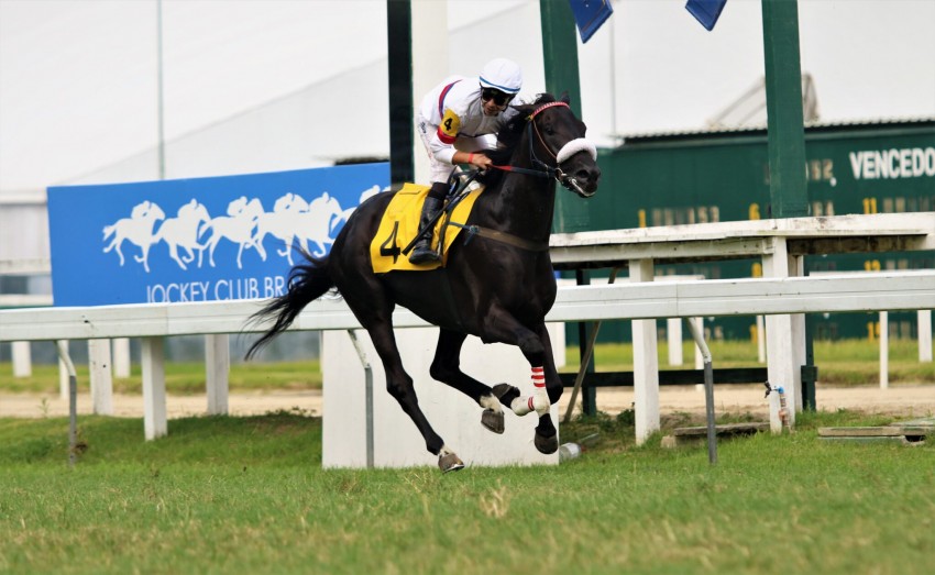 Nada disso, porém, intimidou o potro de 3 anos, filho de Verrazano e Et Voilá (Bernardini), de criação e propriedade do Haras Doce Vale, que se saiu vitorioso ao final do percurso de 3.000 metros, na raia de grama macia.