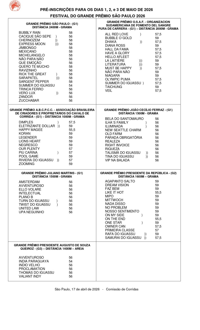 Além dos nomes constantes na lista da prova máxima local, também foram divulgadas as pré-inscrições para os Grandes Prêmios OSAF (G1), ABCPCC (G1), Presidente da República (G2), Juliano Martins (G1), João Cecílio Ferraz (G1) e Augusto de Souza Queiroz (G3).