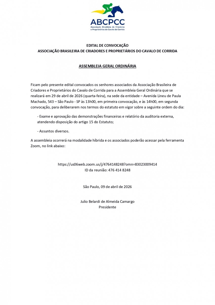 A Associação Brasileira dos Criadores e proprietários do Cavalo de Corrida divulga o edital de convocação da assembleia geral ordinária, marcada para o dia 29/04/2026.